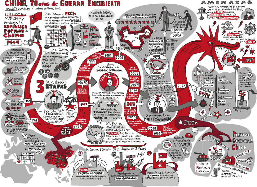 El plan maestro del PCCh, aunque mantiene sus principales objetivos invariables, ha ido utilizando distintas estrategias a lo largo de 70 años de guerra encubierta contra occidente. Descúbralas en esta completa ilustración.