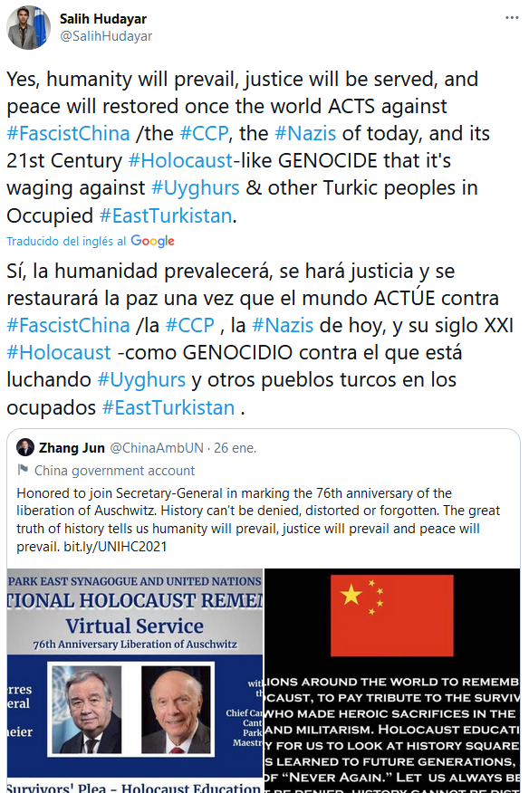 “La política del PCCh es deliberada y calculada para asimilar y erradicar a los uigures y otros pueblos turcos con el fin de transformar la población de Turkestán Oriental en una región Han homogénea. Desgraciadamente, tanto en el caso del Holocausto como en el actual genocidio de uigures, el mundo no actuó a tiempo para evitar las atrocidades a pesar de las pruebas creíbles de que estaban ocurriendo”, dijo Hudayar al DCNF.