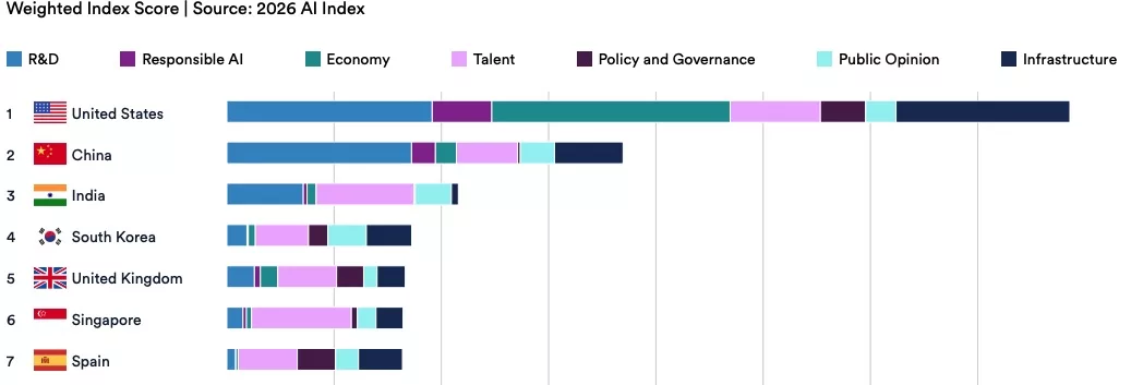 India, aunque históricamente rezagada respecto a Estados Unidos y China, ha acelerado su posición en la carrera de la IA, convirtiéndose en un actor estratégico clave en Asia y en el Sur Global. Según el Global AI Vibrancy Tool de Stanford, India se colocó recientemente en el tercer puesto mundial, detrás de Estados Unidos y China, gracias a su crecimiento en adopción, investigación e innovación de IA.